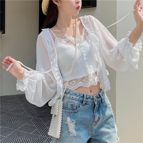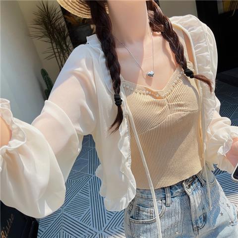 短めの日焼け止めの衣の外に夏の新しいモデルを着て女性の薄手のシフォンのカーディガンはサスペンダーのスカートをつけます