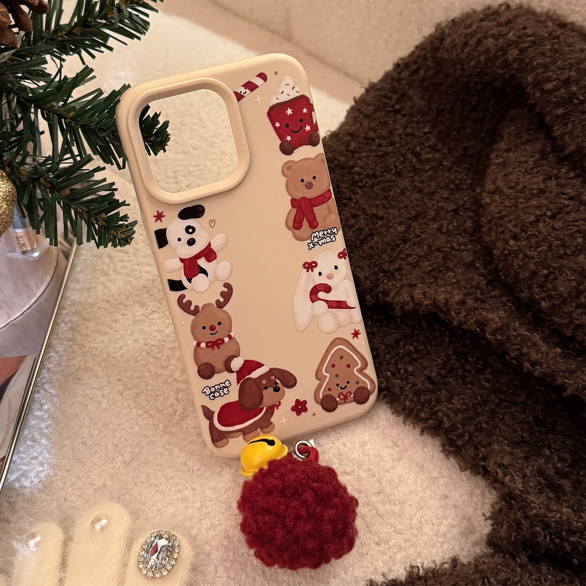 【全商品2点購入で200円オフ】iPhoneケース クリスマス動物/フード柄 ホワイト 17/17Pro/17ProMax対応 雪の玉ゆらゆらスタンド別売 赤ポンポン鈴ストラップ別売 (iPhone1