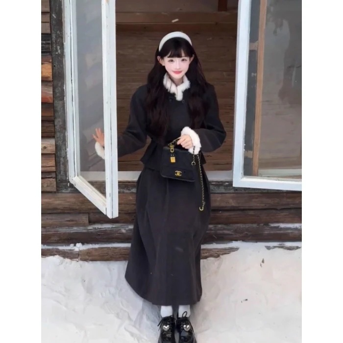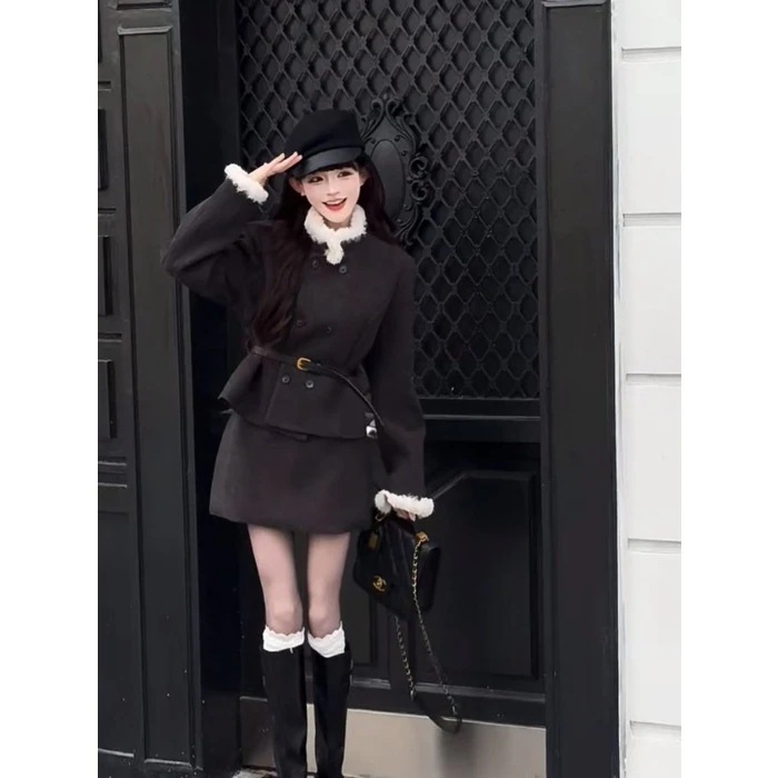 【人気アイテム】レディースファッション 財閥令嬢 雰囲気 2 点セット レディース 冬 ファーカラー ダブルブレスト シャネル風 ハイウエスト ヒップライン ハーフスカート 高級感