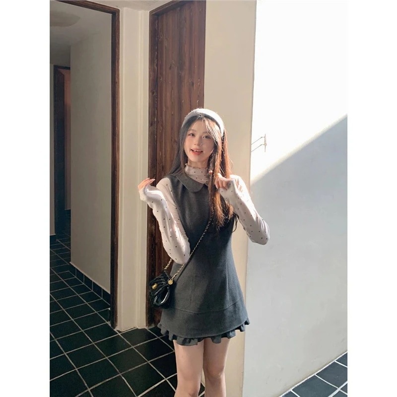 【人気アイテム】レディースファッション レディース ハイネック 水玉柄 ロングスリーブ インナートップス 学園風 2025 秋冬 新作 ノースリーブワンピース 2 点セット