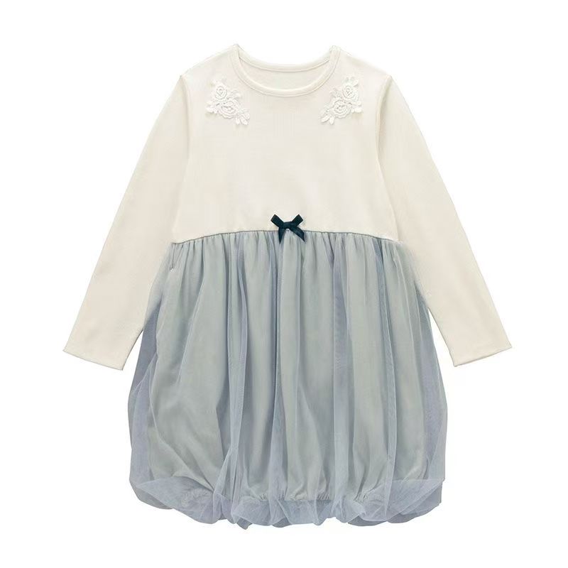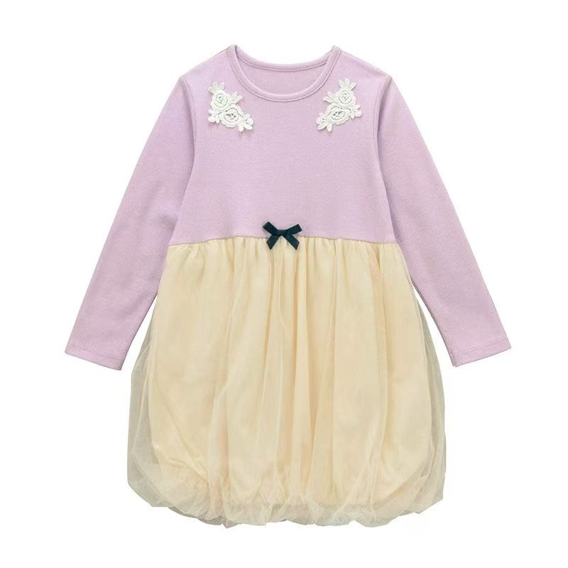 高級児童服 春秋用 メッシュデザイン カラーブロッキング シンプルスタイル フェイクツーピース 純色 プリンセススタイルのワンピースワンピースドレス