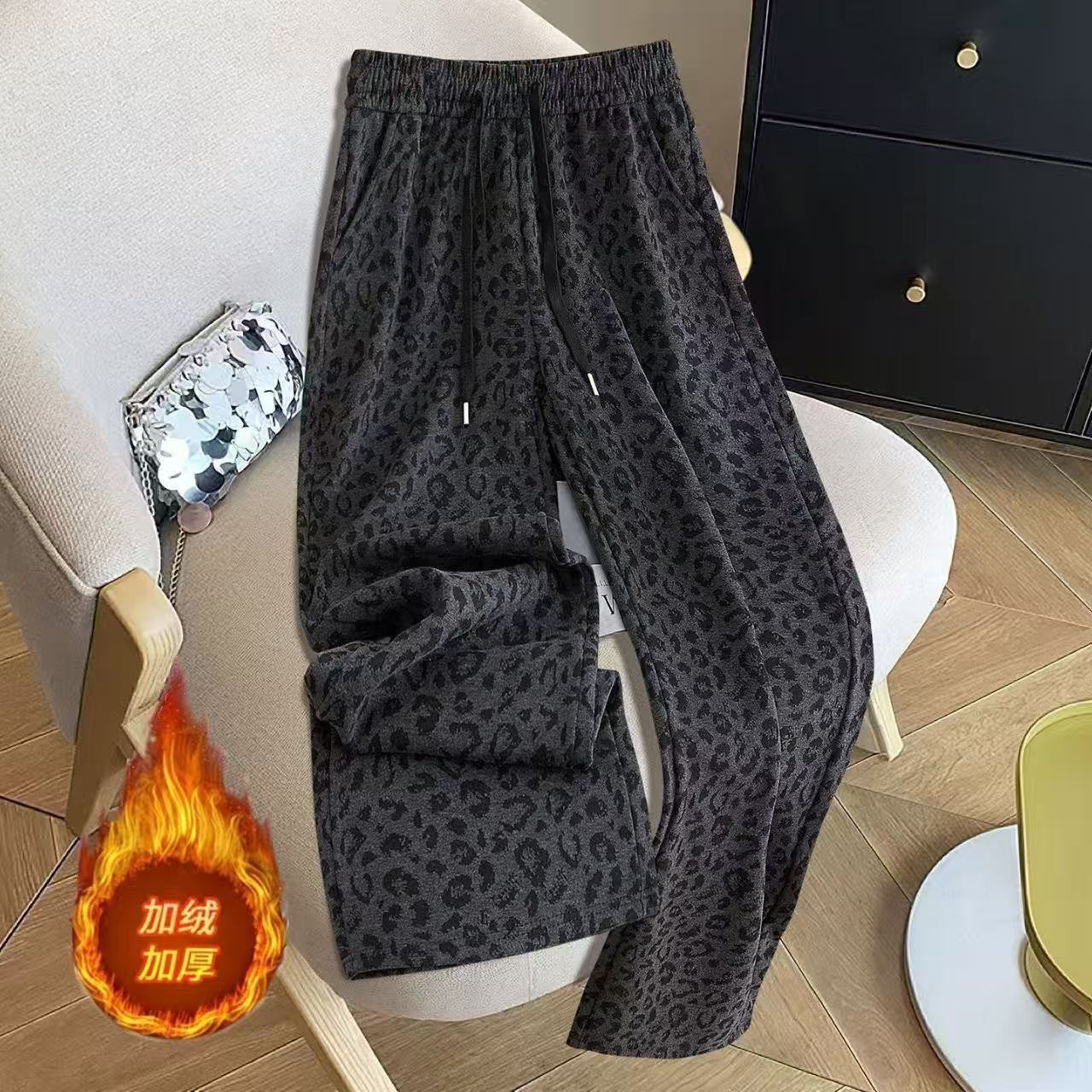 裏起毛 厚手 ヒョウ柄 プリント カジュアル ロングズボン レディース 秋冬 新しい ハイウエスト 着痩せ ワイドレッグ