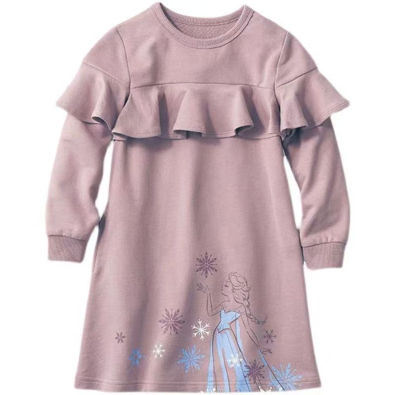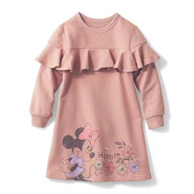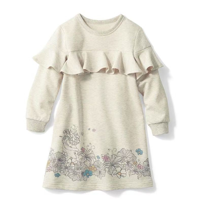 春秋の新作 女の子用 綿のパイル生地 カートゥーン柄 A ラインスカート ロングスリーブのワンピース 赤ちゃん用 レース付き レディース風ワンピースドレス