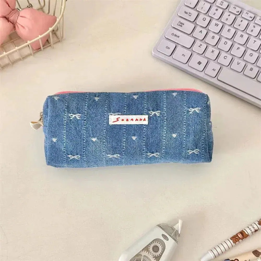 【3日出荷】新作 デニムブルー 刺繍 リボン 文具 ペンケース かわいい 女子心 大容量 筆箱 収納袋 女子
