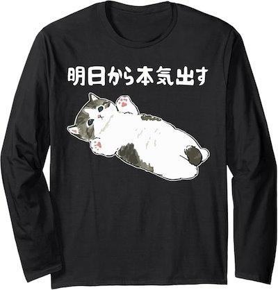 コットン100%Tシャツ 長袖 明日から本気出す 猫のことわざ 面白いデザイン プリント 男女兼用 パロディ 秋冬服