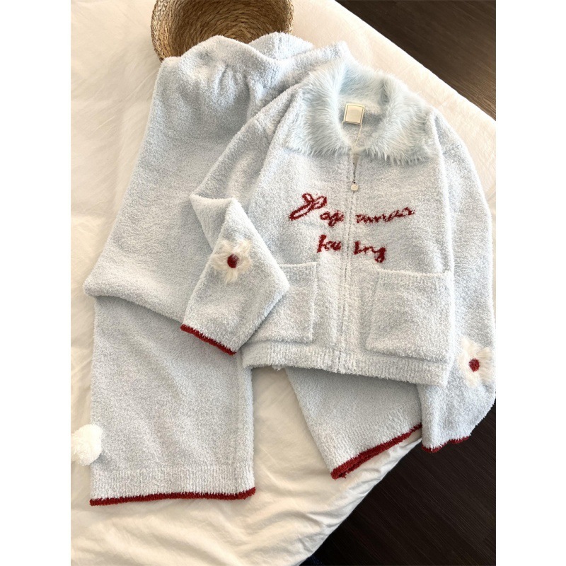 シンプルな文字プリントの半フリースパジャマ新しい秋冬スタイルレディースの裏起毛で厚手のホームウェアセット