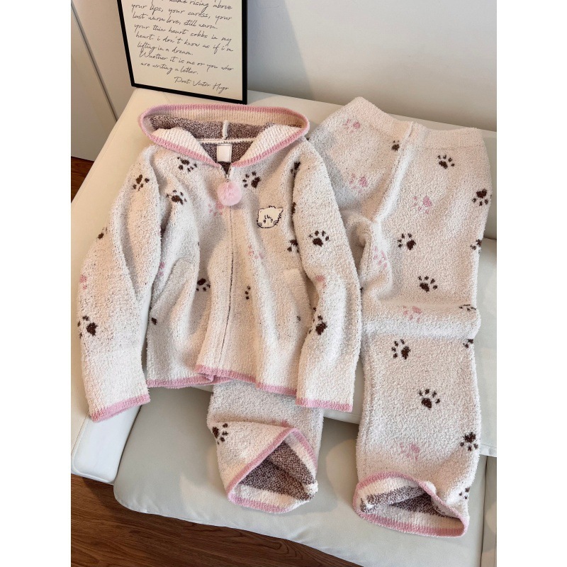韓国風のキュートな猫耳と足跡柄フード付きハーフフリースパジャマ新しい冬スタイル快適なアウターウェアとホームウェアセット