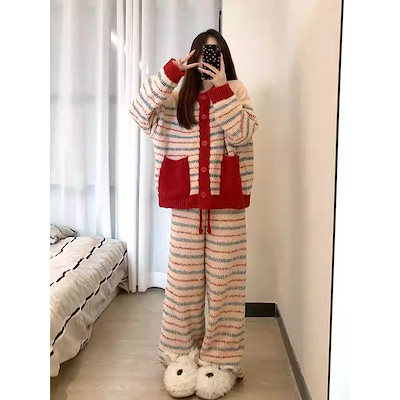韓国風の柔らかく肌に優しい女性用ハーフフリースパジャマ2024年冬ニットカーディガンとズボンのラウンジウェアセット