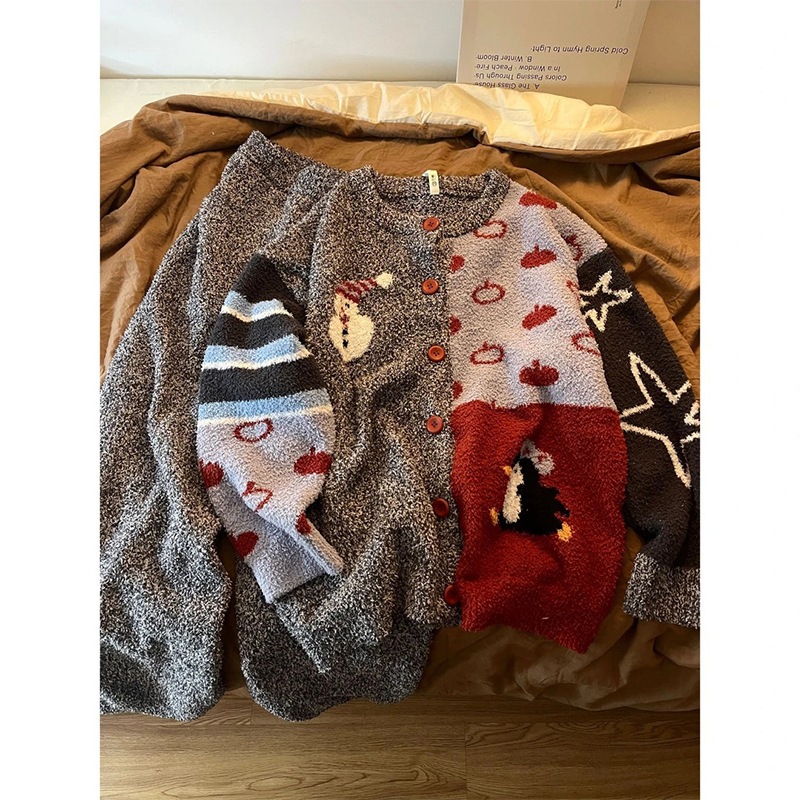 グレーと赤のパッチワークデザインのハーフフリースパジャマセット(女性用)キュートで心地よいニットカートゥーンホームウェアセット