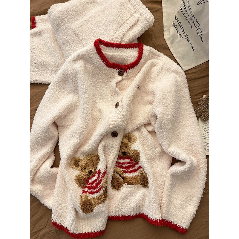 韓国風の漫画クマのニット半フリースパジャマ女性用厚手で暖かい冬用ラウンジウェア2点セット