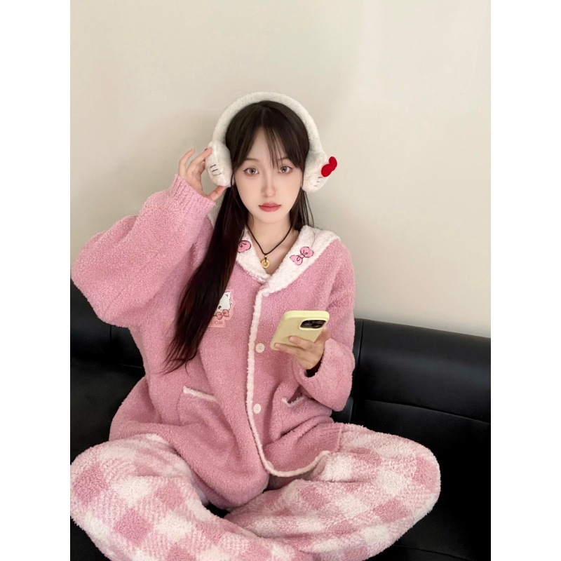 甘くてかわいい半フリースの暖かい女性用パジャマ秋冬新作のニットフリース裏地と厚手のホームウェアセット