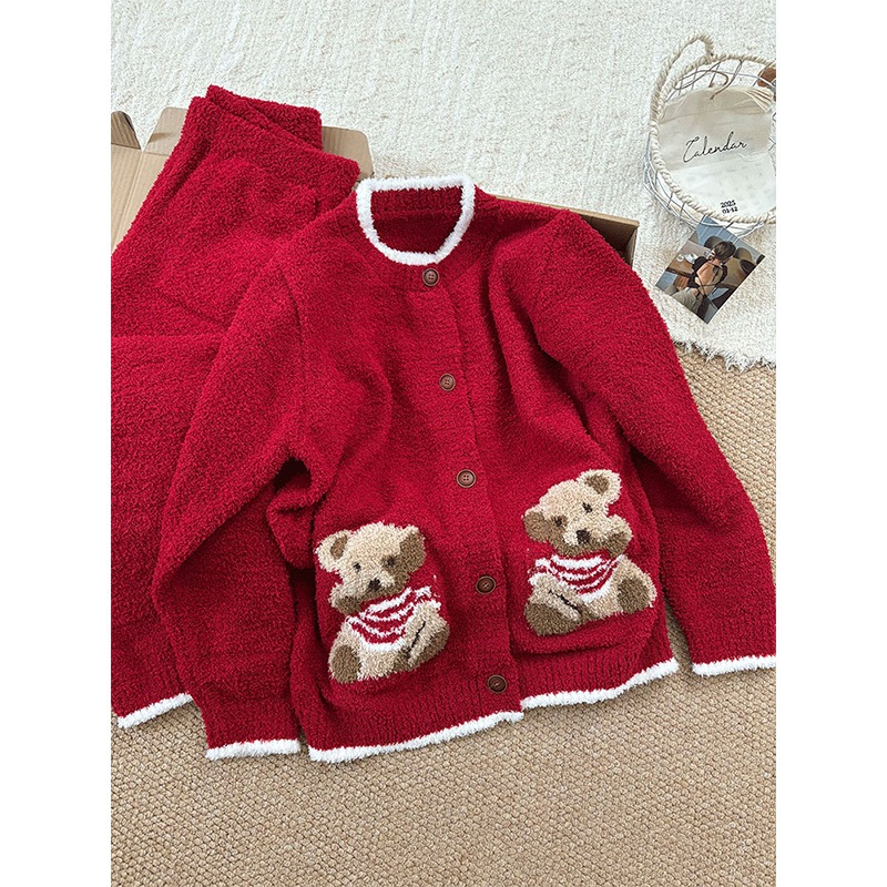漫画クマの赤いハーフフリースパジャマ女性用秋冬用厚手暖かいホームウェアセット