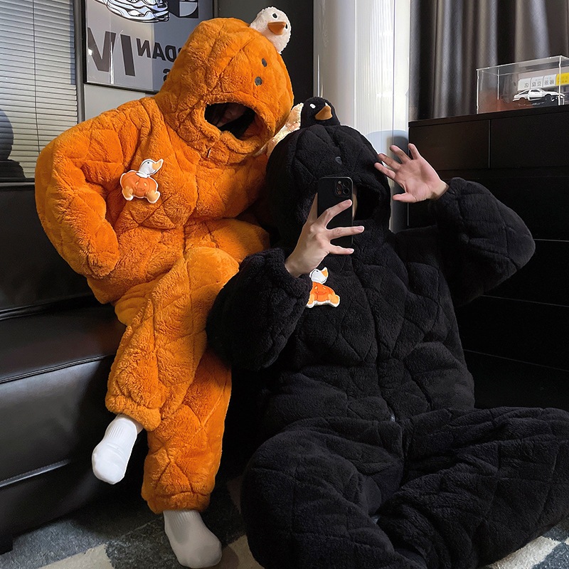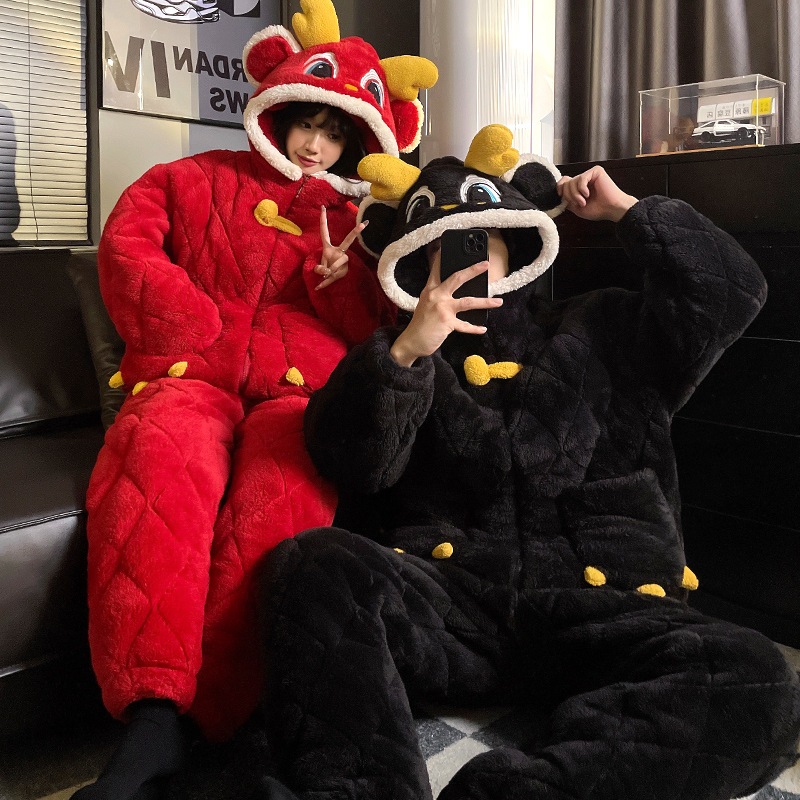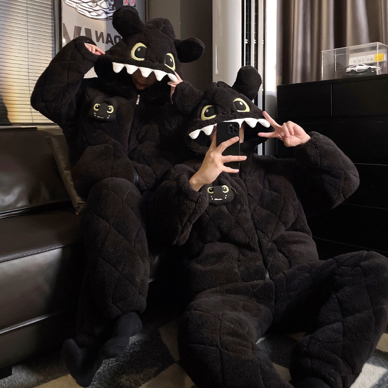 男性と女性のための新しい冬のパジャマ漫画の歯のない3層キルティング厚手のフリース裏地付きキュートで暖かいホームウェアセット