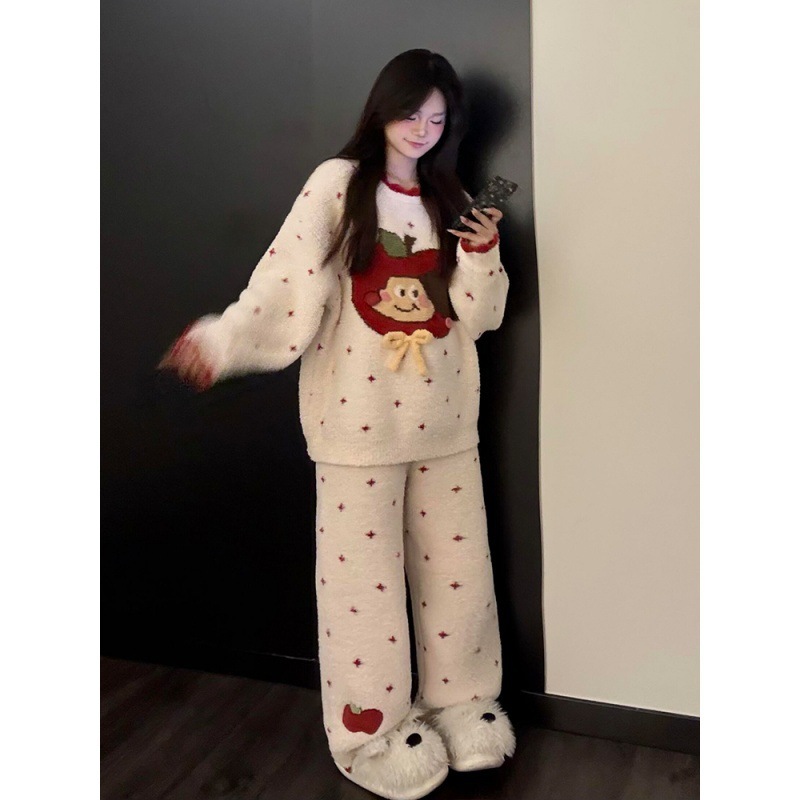キュートな漫画のリンゴ柄のハーフフリースパジャマ秋冬新作暖かいニットの長袖ホームウェアセット