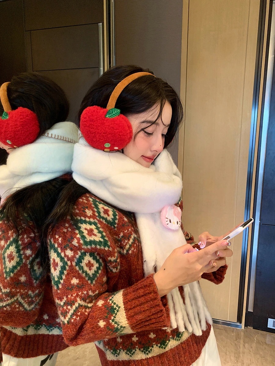 冬季学生用アウトドアサイクリング耳当て 赤いリンゴのふわふわ耳当て防寒防凍保温耳カバーイヤーマフ