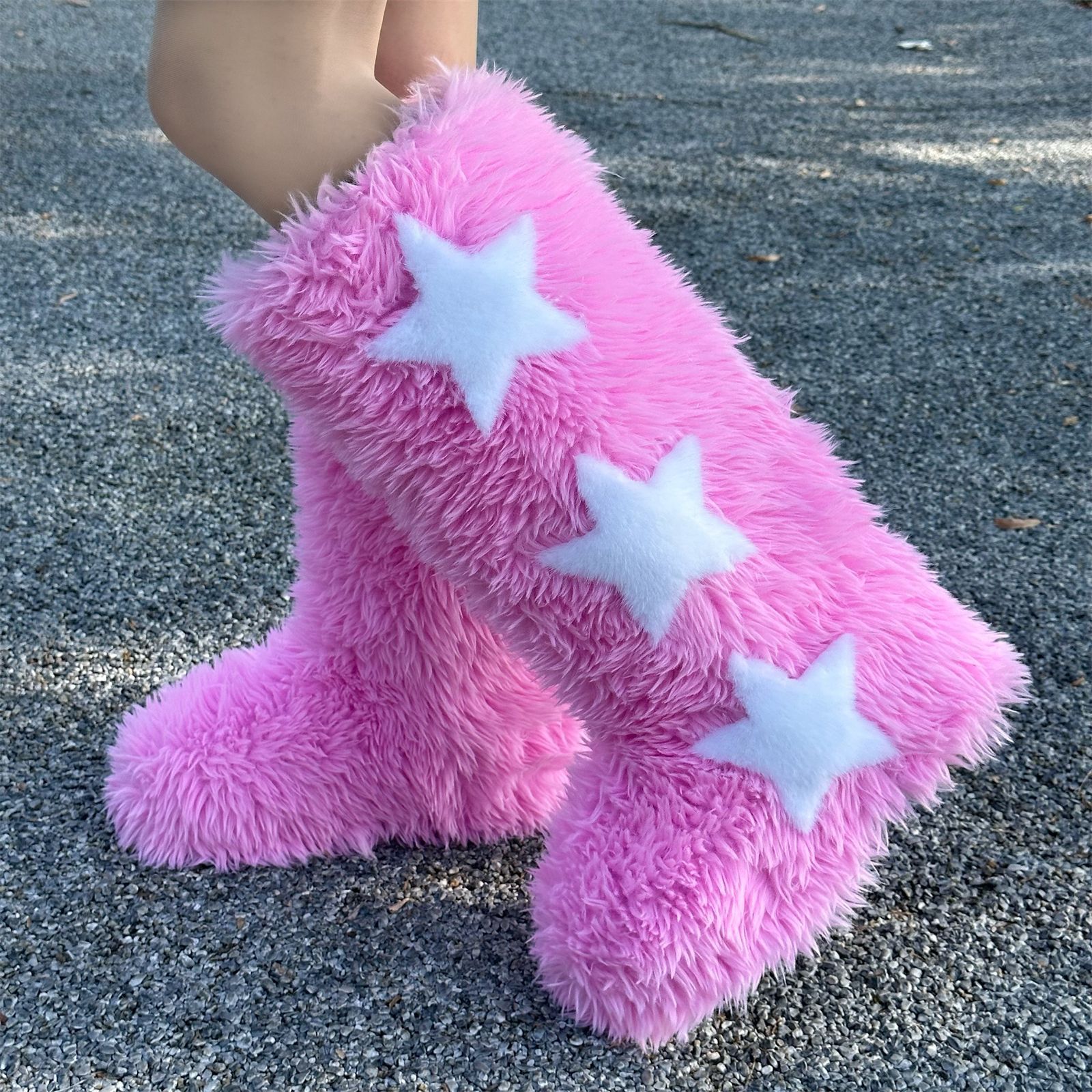 星柄フェイクファー ロングブーツ 個性派 Y2K 厚底 フワモコ 防寒シューズ Y2Kブーツ 星柄ブーツ フェイクファーブーツ 厚底ブーツ 海外ファッション ストリートコーデ 冬ブーツ 個性派ファッシ