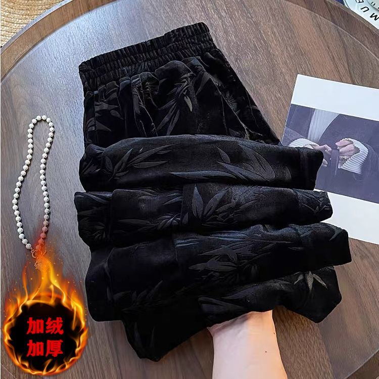 新しい チャイナ式 ブラック 着痩せ ベルベット ワイドレッグ レディース 秋冬 2025 裏起毛 ハイウエスト 墨竹 ジャカード カジュアルパンツ