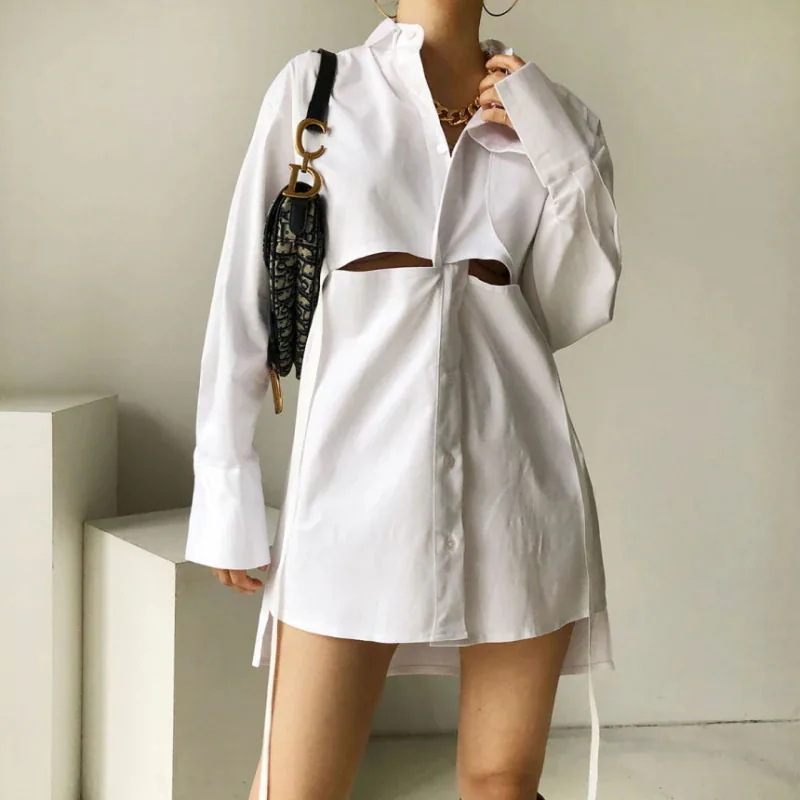 【3日出荷】クロス透かし編み X 型ウエストリボン 長袖シャツワンピース カジュアルレディース 新生活