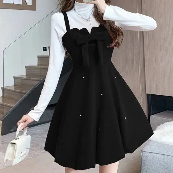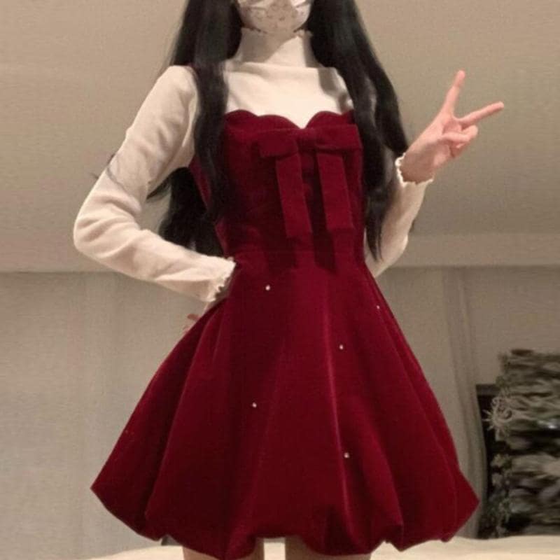 クリスマス用品 サンタコスプレ クリスマス レッド 蝶ネクタイ ストラップドレス ツーピース セット 優しい 冬のドレス 韓国ファッション