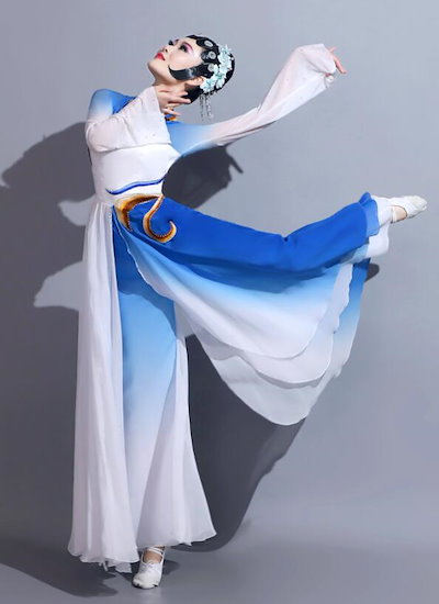 中華古典舞踊 ダンス衣装セット 大人 子供 チャイナ民族風ダンス衣装 白青 グラデーション ロング丈 ワンピース サイドスリット シフォン 飄逸 古典ダンス ドレス ワイドパンツ 袖スリ