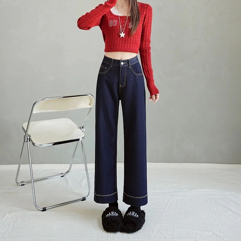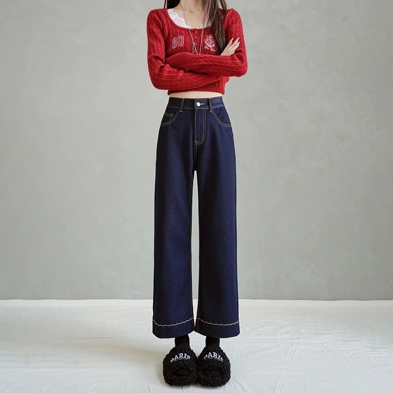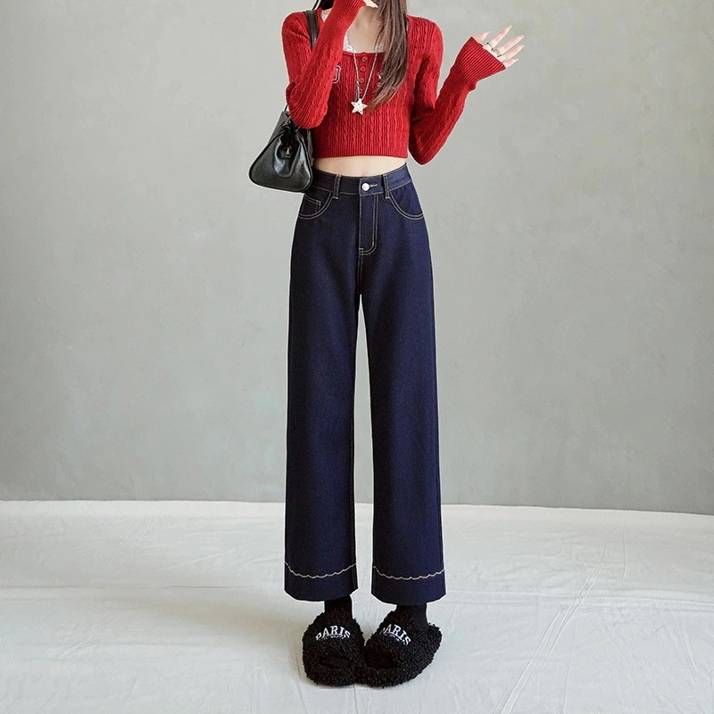 【3日出荷】4 ウェイストレッチデニムパンツ ドレープワイド刺繍 着痩せクロップドストレートモデル 春秋季 ズボン