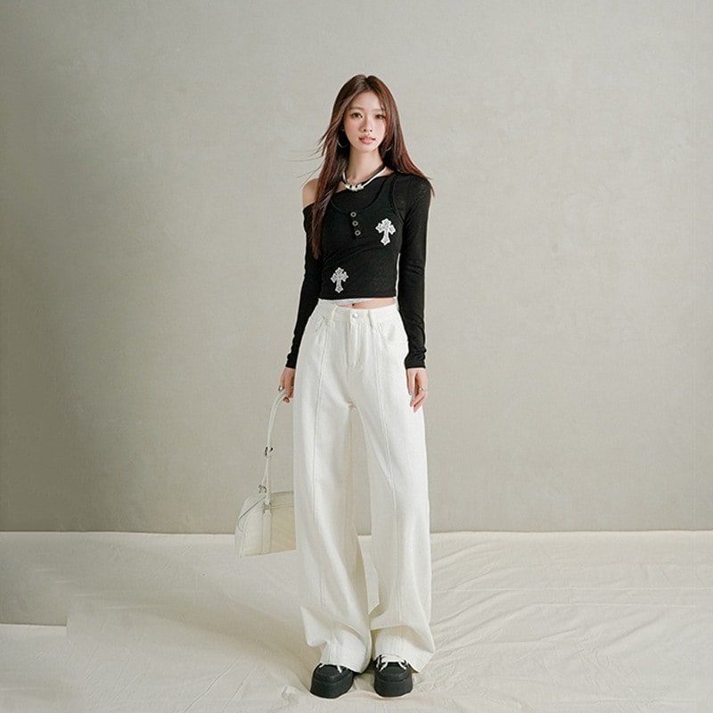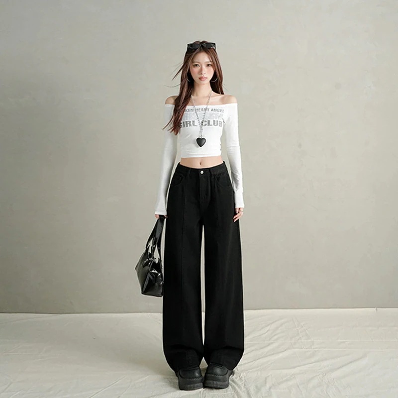 【3日出荷】ミニマルクールブラックデニム ポケットカバーボタンデザイン 着痩せワイドパンツ 春秋季 ズボン