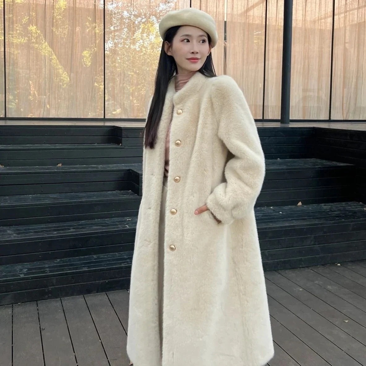 【人気アイテム】秋冬 レディース 新作 ミンク調 スタンドカラー コート 厚手 ルーズフィット ラムスキン 中丈 ファーアウター コート
