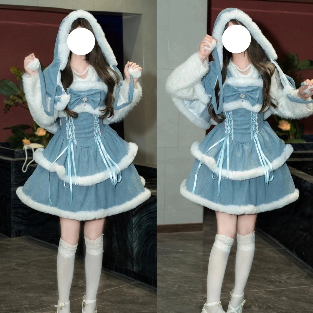 クリスマス 正月 ワンピース+ケープ2点セット ロリータ デニム ふわふわ レッド ブルー ケーキフリル 冬 ギフト プレゼント デート おしゃれ