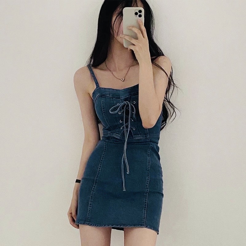 デニムレースアップリボンキャミミニワンピース 美シルエット デニムワンピース レディース タイト ミニ丈 レースアップ キャミワンピ 細見え 着痩せ 夏 きれいめ おしゃれ カジュアルコーデ a300
