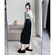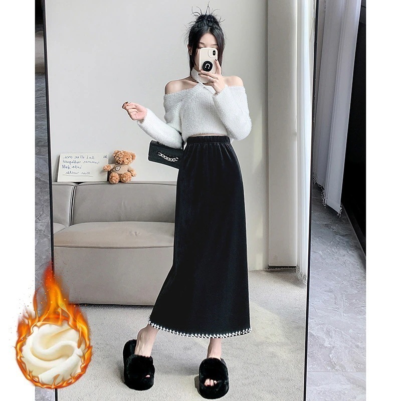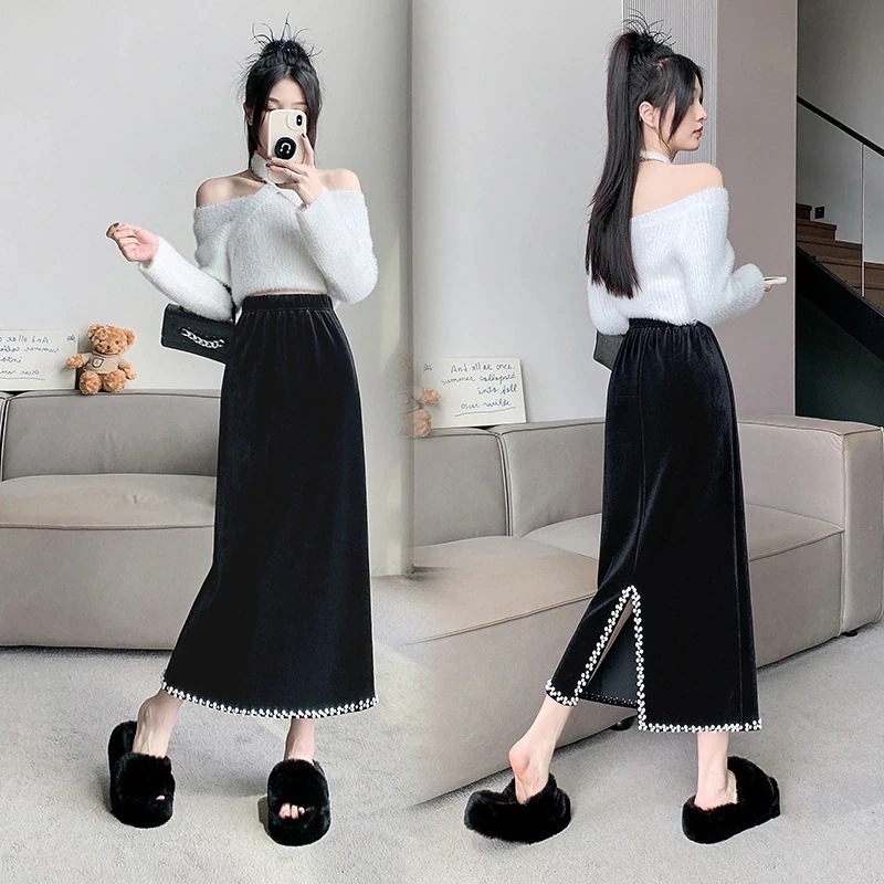 【3日出荷】ベロアハイウエスト レディース秋冬ミッドレングス ドレープ感 ヒップ隠し スリットストレート スカート