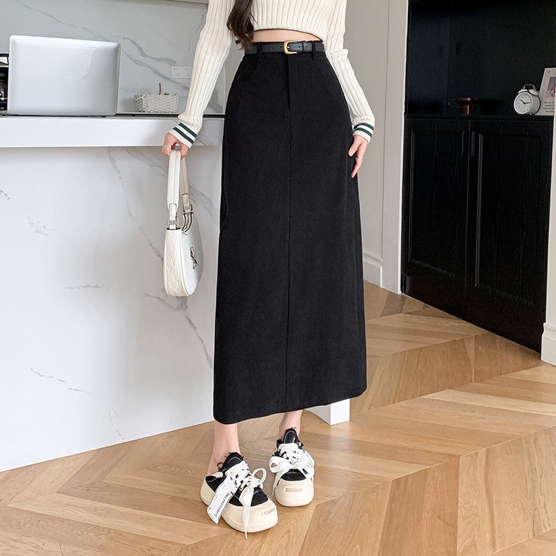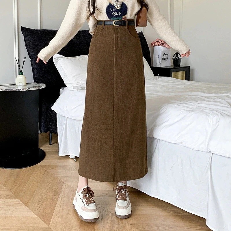 【3日出荷】コーデュロイハイウエスト レディース秋冬ミッドレングス スリム効果 エレガント ストレート スカート