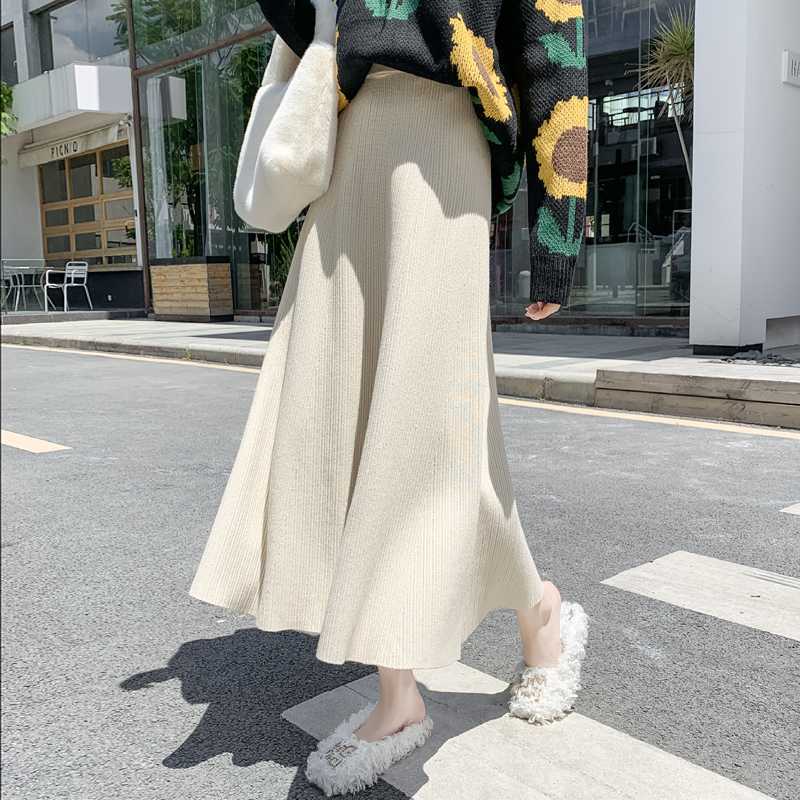 【3日出荷】レディース秋冬ニットハイウエスト ミッドレングス ドレープ感 A ラインフレア ニー越えロング スカート