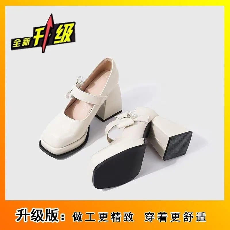 【3日出荷】レディース 厚底 ワンピース合わせ メリージェーンハイヒール 冬新作 ホワイト 太ヒール ラウンドトゥ レザーシューズ