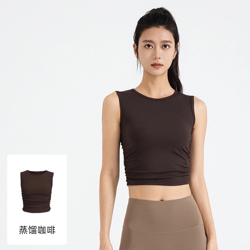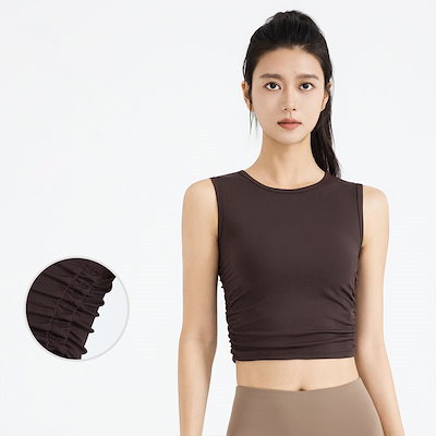 新作 両サイドプリーツリブ 袖なしスポーツトップス スポーツブラ シェイプアップウエスト ヨガウェアタンクトップ