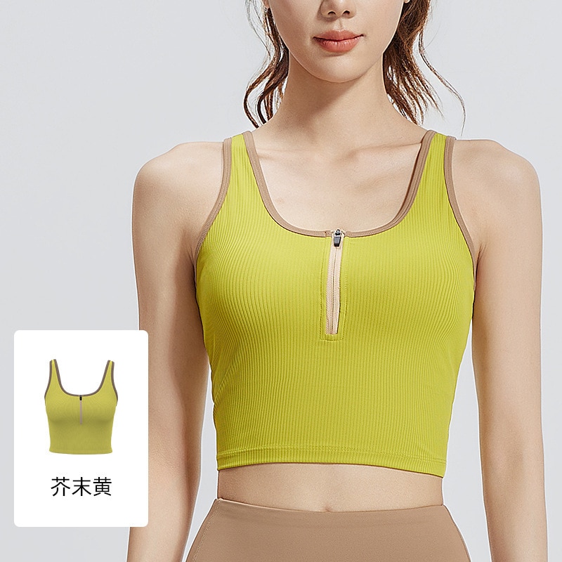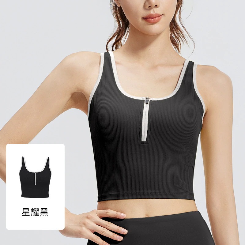 ストライプファスナーカラーブロックヨガウェアタンクトップ 固定カップ防震ランニングスポーツブラ女性用