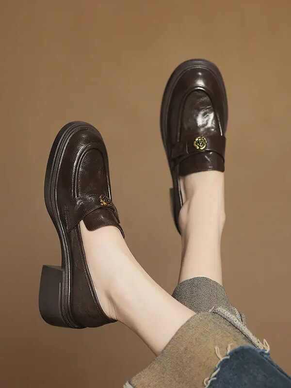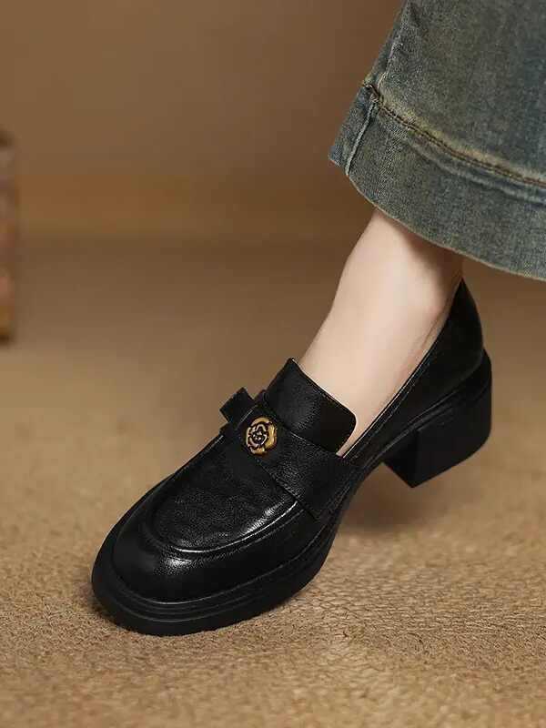 羊の皮 ~ 英倫の復古の厚い底の太さとツバキの花の楽福の靴の女性はスカートの小さい革靴を配合して黒い靴に通勤します