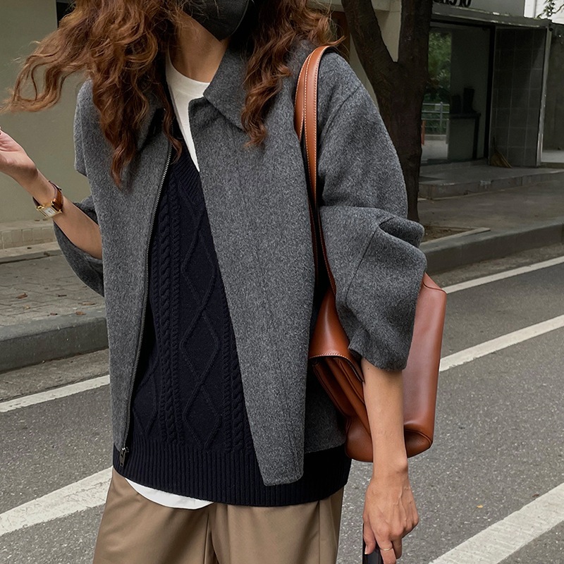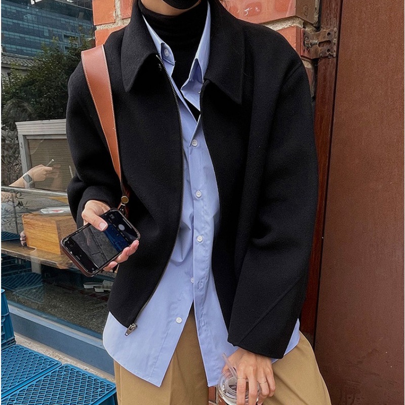 韓国のchi秋冬スタイルのレトロでシンプルなフレンチスタイルの襟付きジッパー