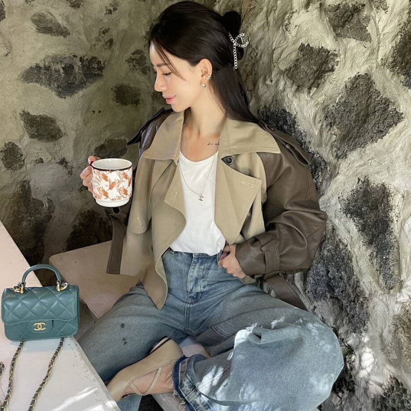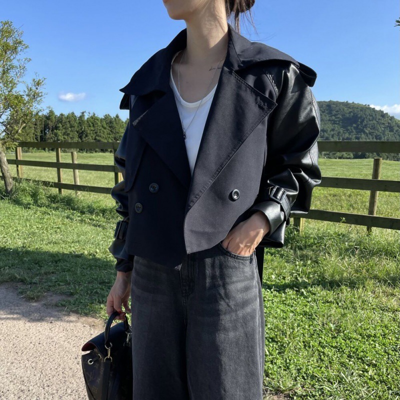 韓国chi春秋デザイン感大衆気質高級つなぎPU袖衝突色ゆるいコート2色