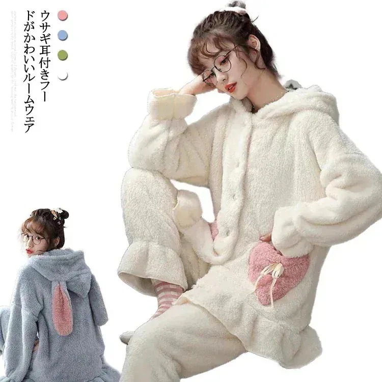 パジャマ ウェア レディース ウサギ耳 マイクロファイバー 上下セット 長袖 前開き セットアップ 羽織り もこもこ ふわふわ 裏起毛 部屋着 ナイトウェア 厚手 暖かい 寝巻き 寝間着