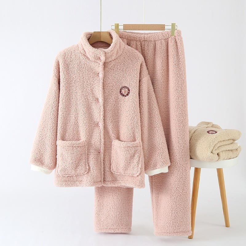 【冬用】レディースラムズウールパジャマ 立襟フランネル 無地 可外穿 ゆったりフィット 防寒ホームウェア