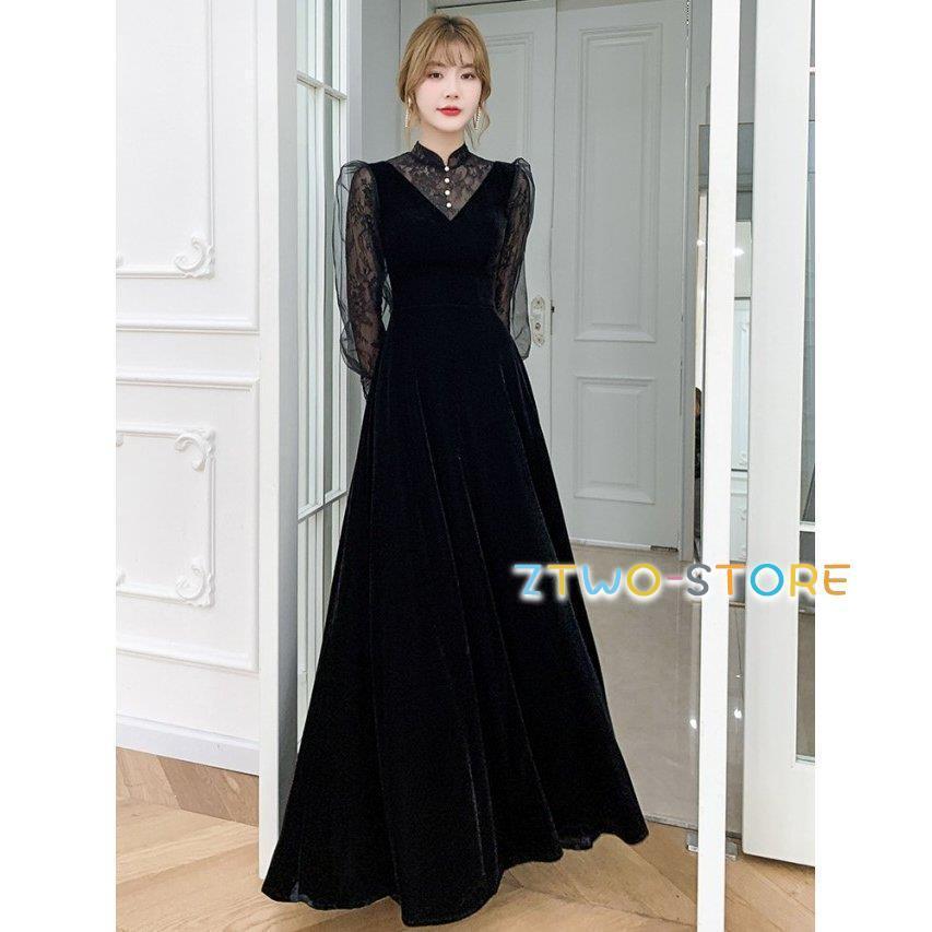 結婚式 ロングドレス パーティードレス 黒 ロング 長袖 韓国 お呼ばれドレス 袖あり シースルー袖 おしゃれ 大きいサイズ 3L 小さいサイズ