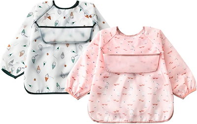 早いもの胜ち食事用エプロン ベビー お食事エプロン 長袖 子供用 防水 軽量 立体ポケット18ヶ月から42ヶ月 2枚セット(xg158)