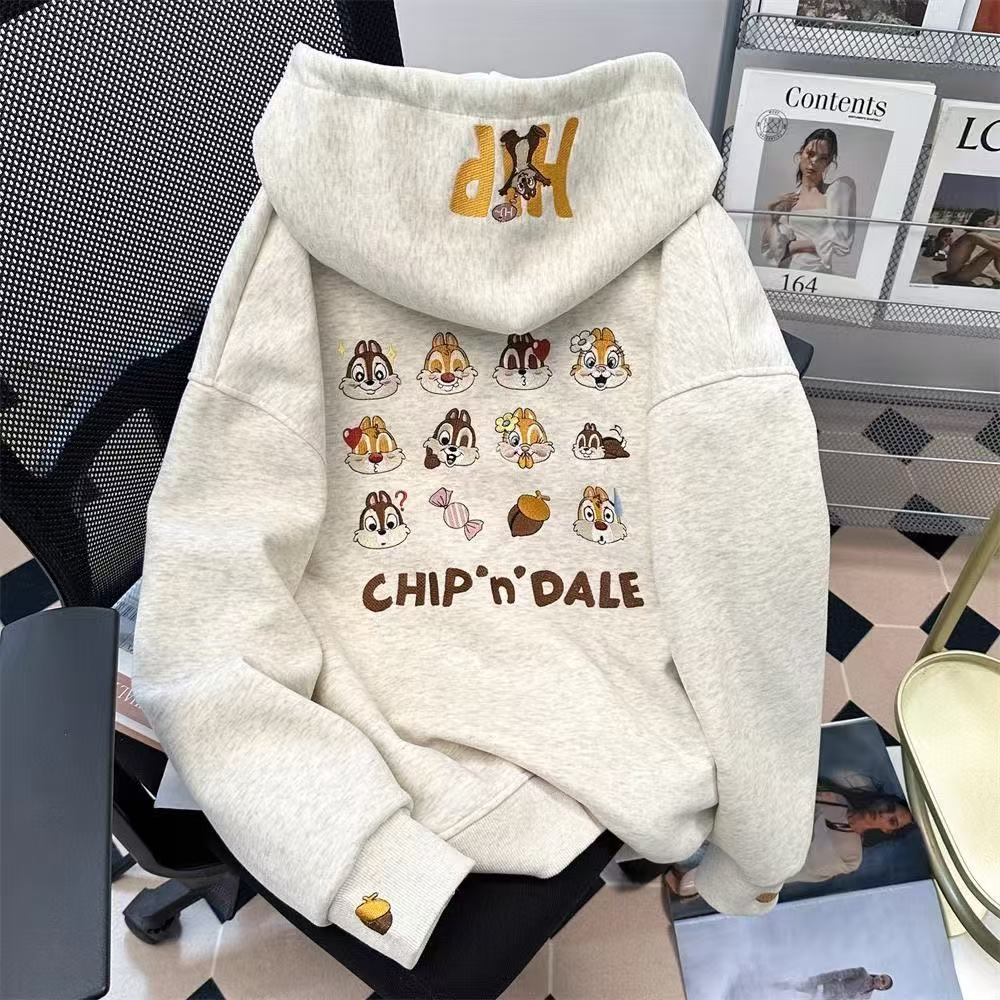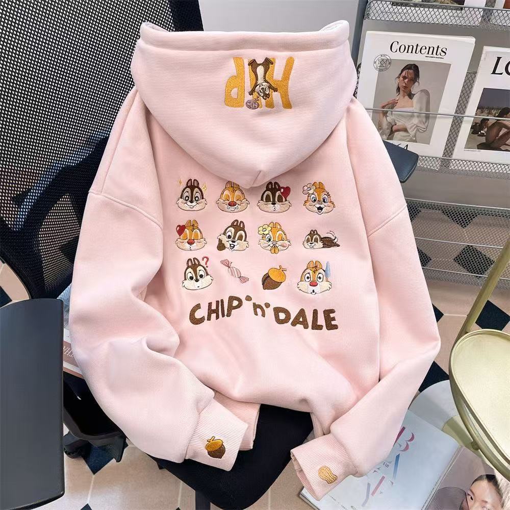 【急速出荷】ヘビーステッチ刺繍チップとデールトップス レディース ラウンドネックルーズスウェットシャツ トレーナー長袖 パーカー