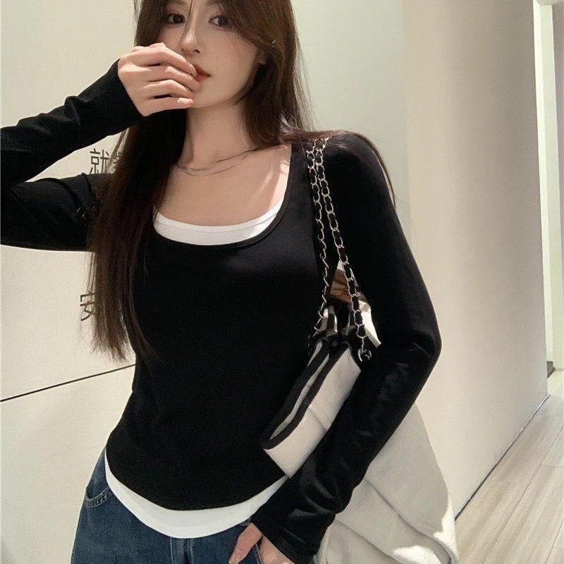 2025 秋冬 ツーインワン 長袖 T シャツ レディースリブ素材 シェイプアップ ボタンデザイン日韓風 だらけた雰囲気 インナー