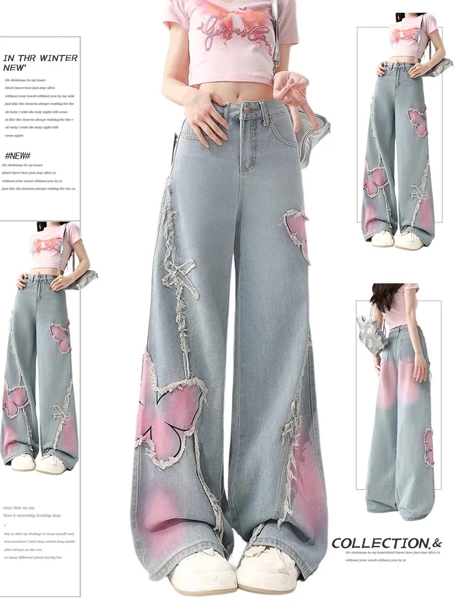 【人気商品】アメリカンスタイル 刺繍 蝶のグラデーション ワイドパンツ ジーンズ レディース 春 秋 新作 ユニーク デザイン性 スリム効果 ストレートパンツ