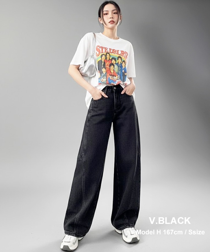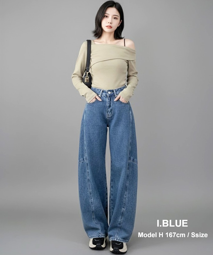 【S~LL】カーブパネル ワイド デニム パンツ (丈長め76cm) レディース 股上深め 綿100% ハイライズ カーブシルエット ハイウエスト スーパーワイド バギーデニム