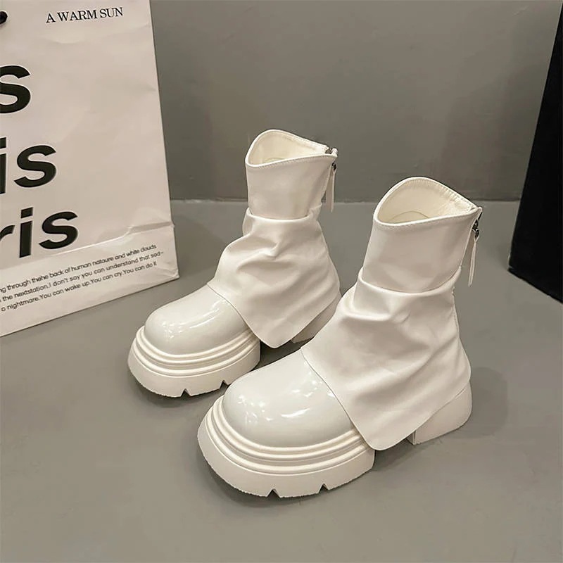 2025年新作 秋用 ホワイト マーチンブーツ 女性用 低身長向け厚底ヒール ヴィンテージ風ワイドレッグブーツ ブリティッシュスタイル ショートブーツ
