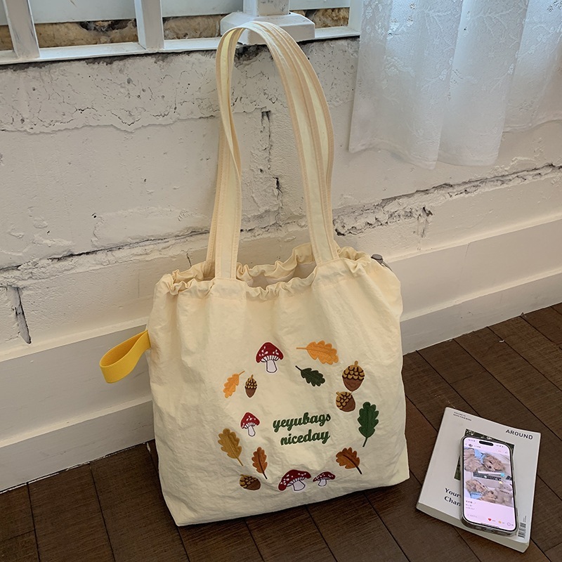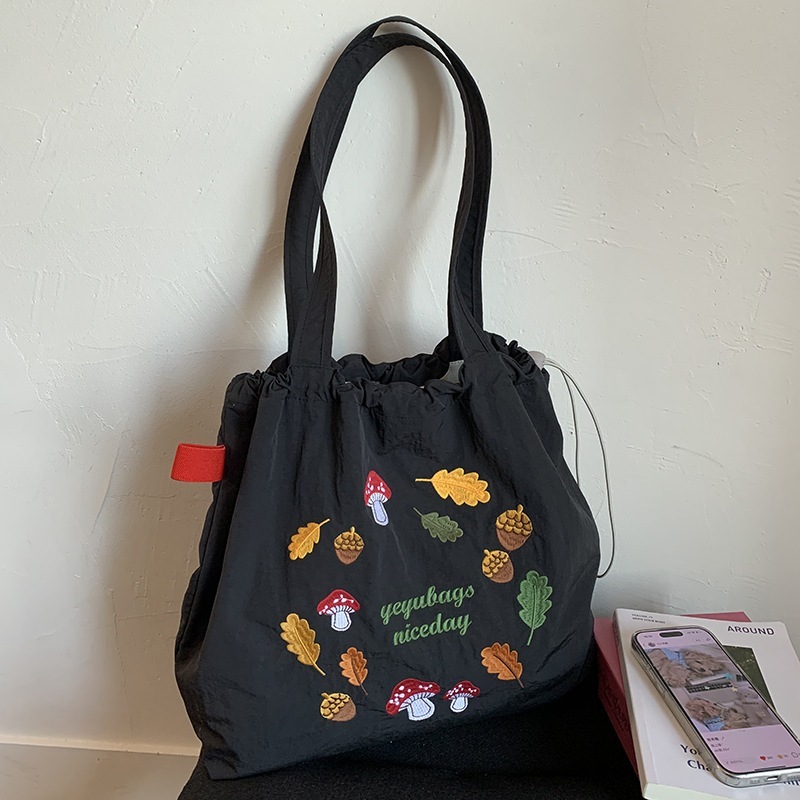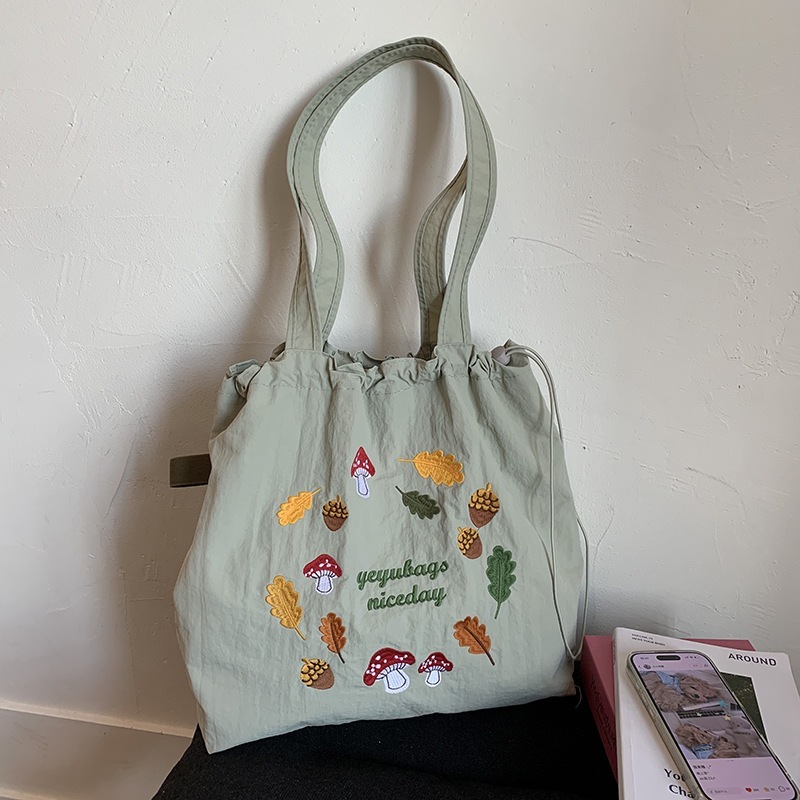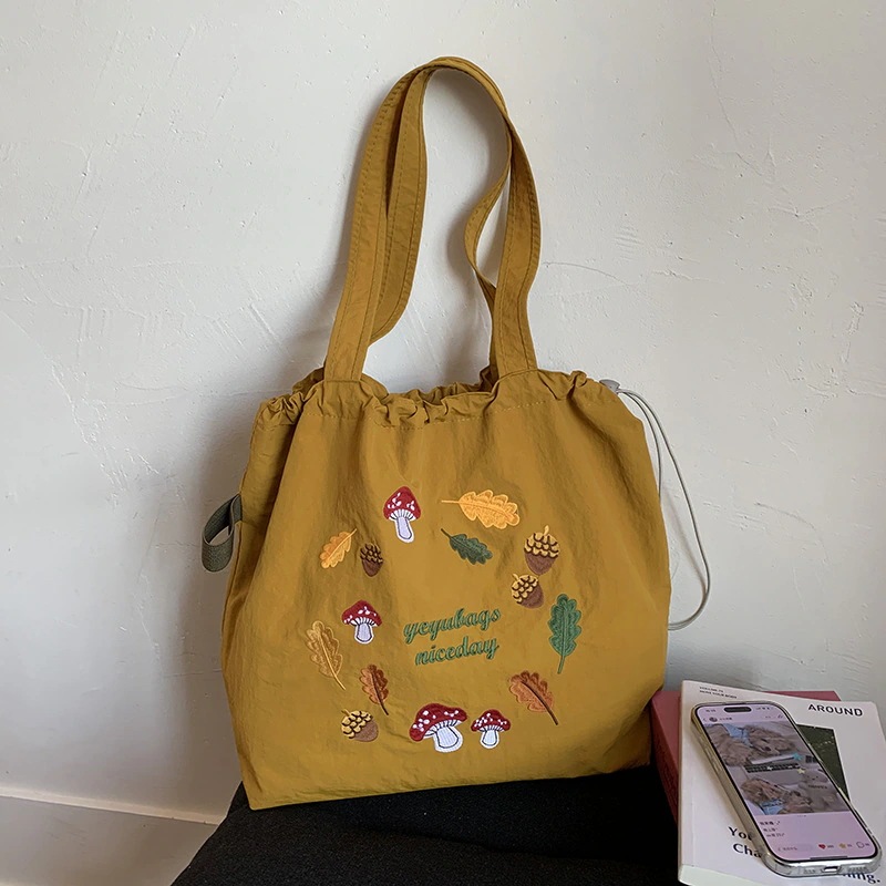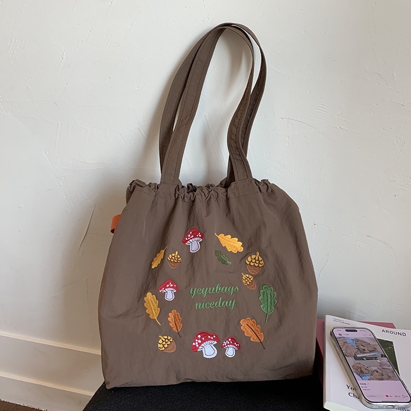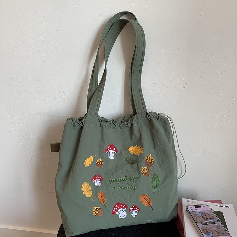 きのこ刺繍レトロナイロントートバッグ大容量刺繍ワンショルダーバッグ学生通勤バッグ