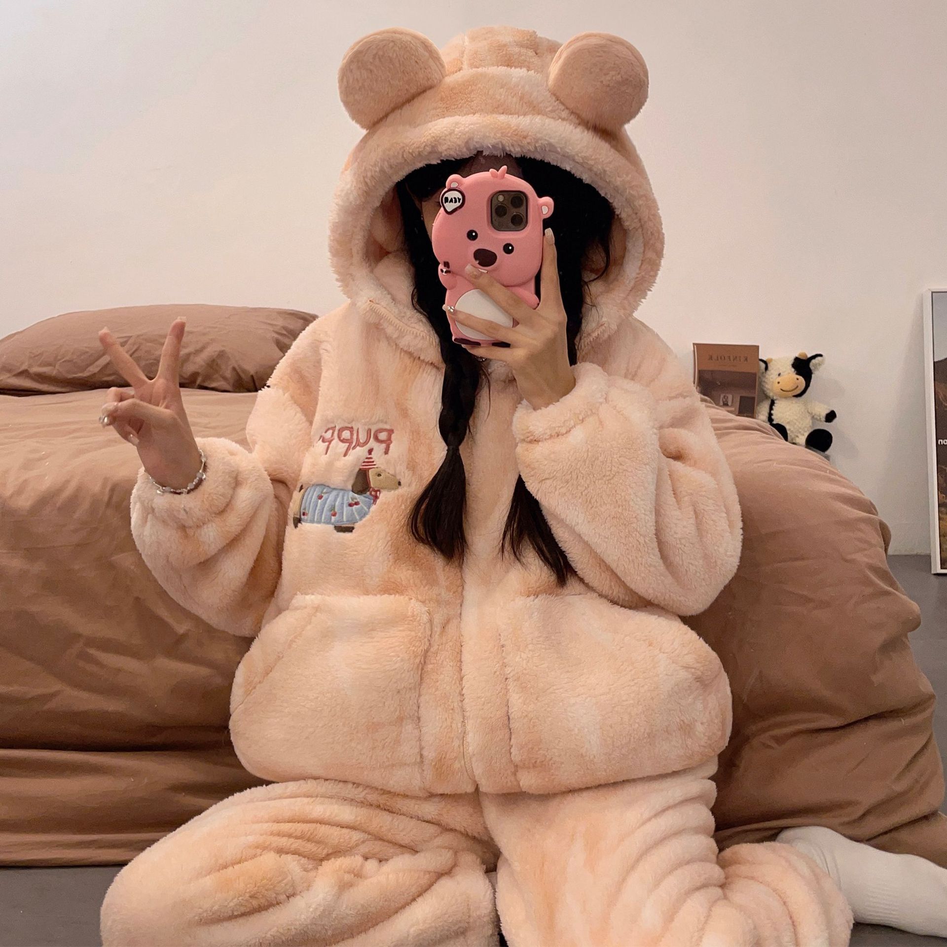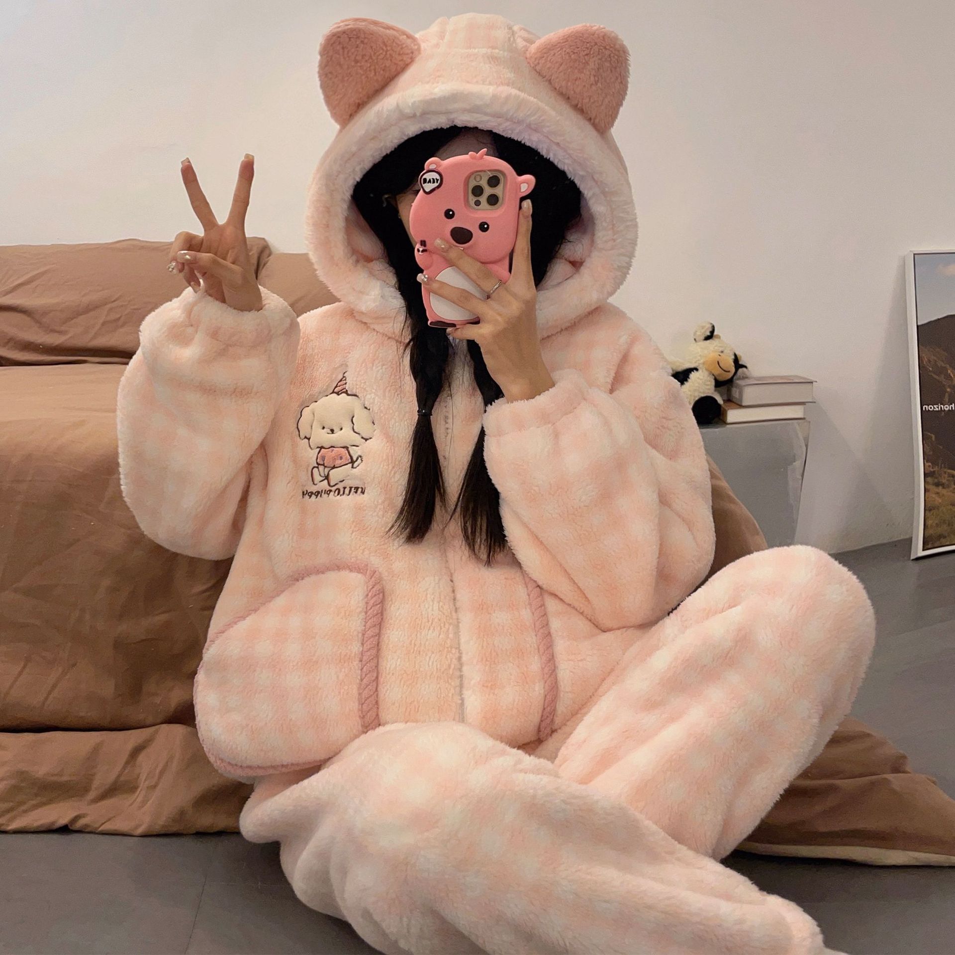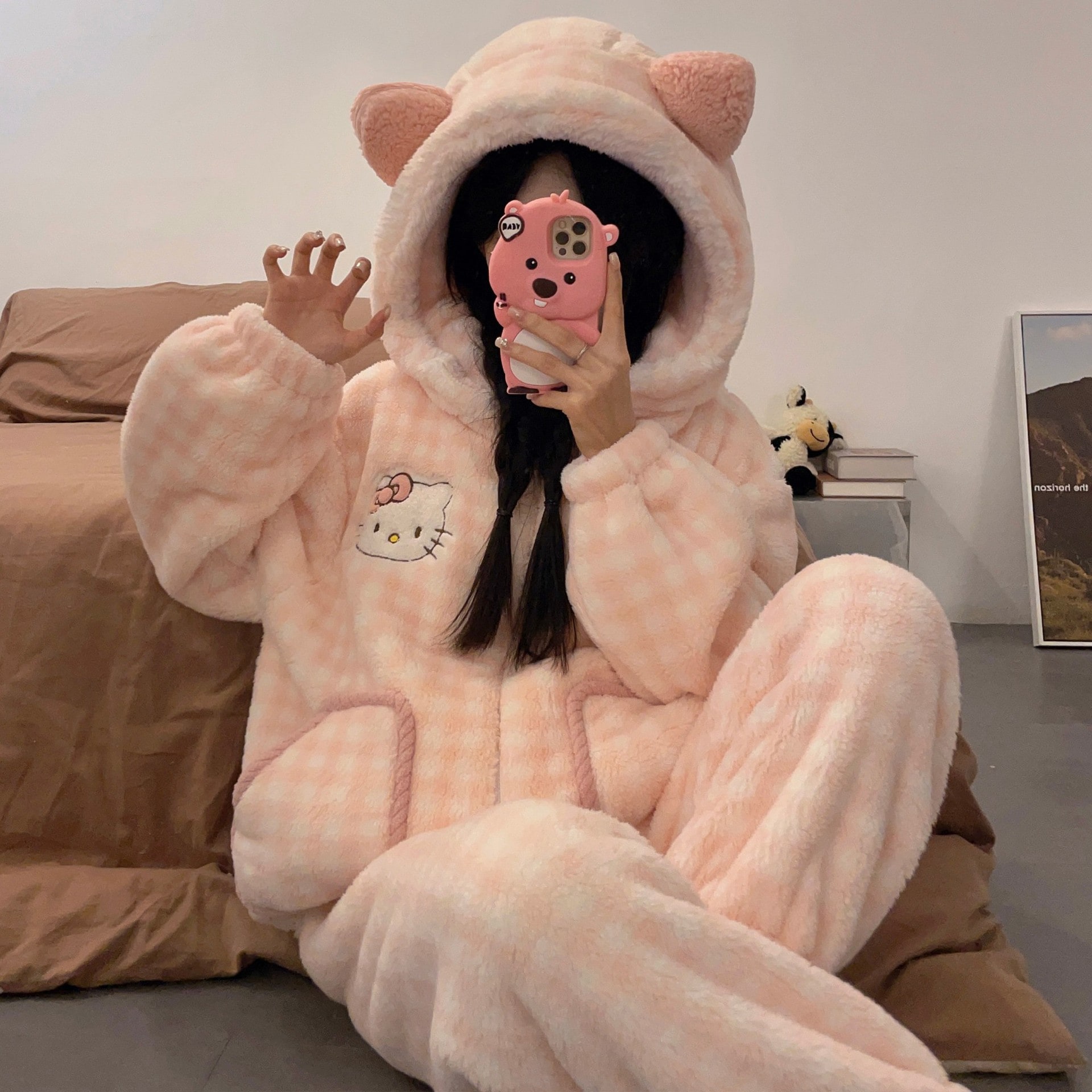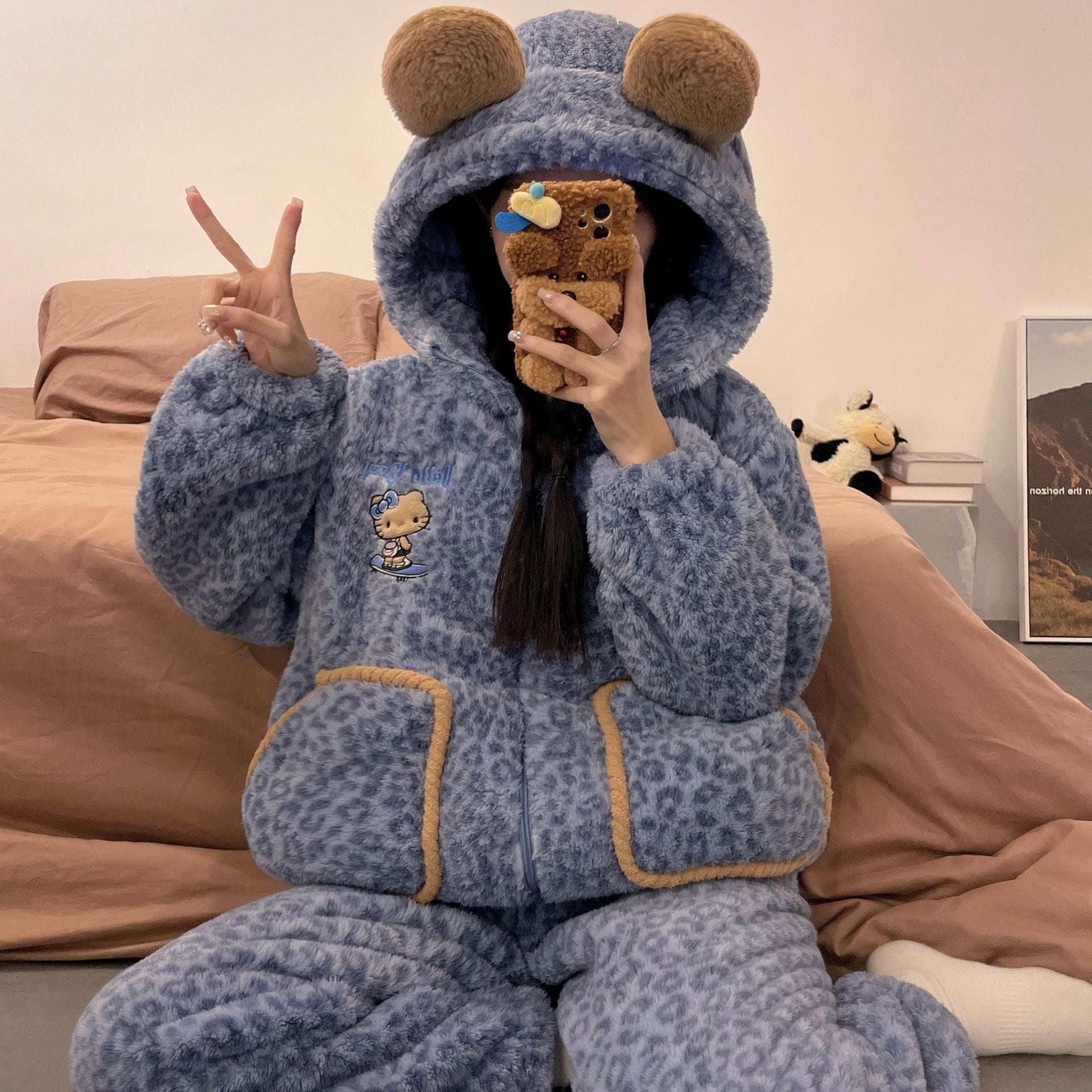 かわいいキティのパジャマ女の新コーラルダウン厚手保温フランネルの部屋着セット