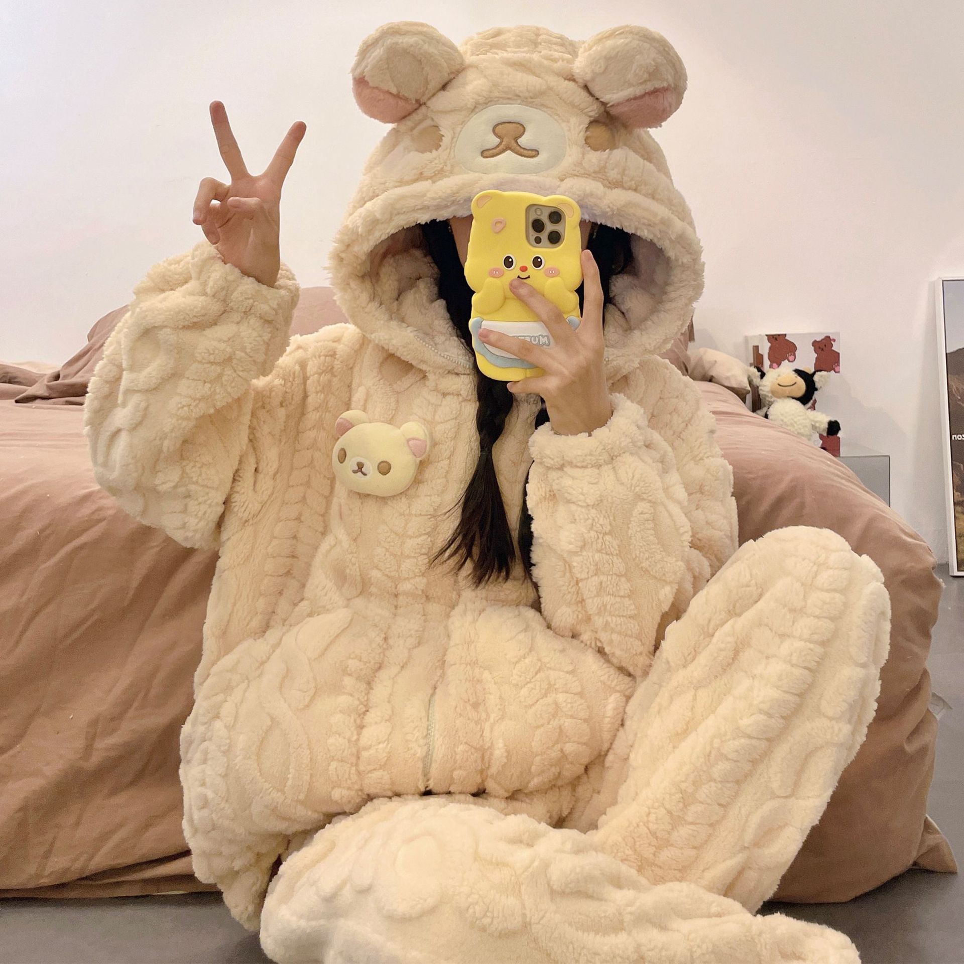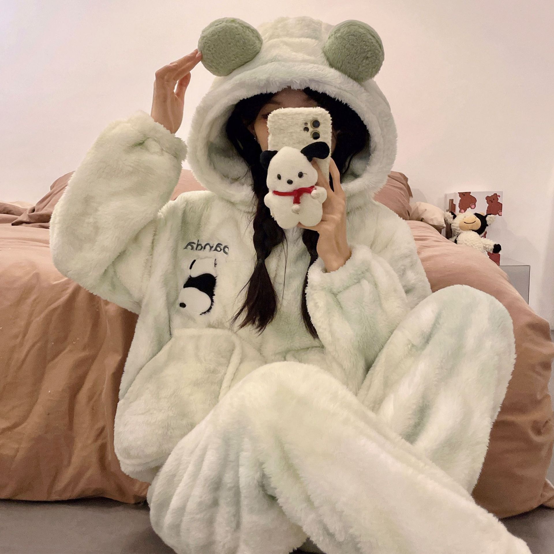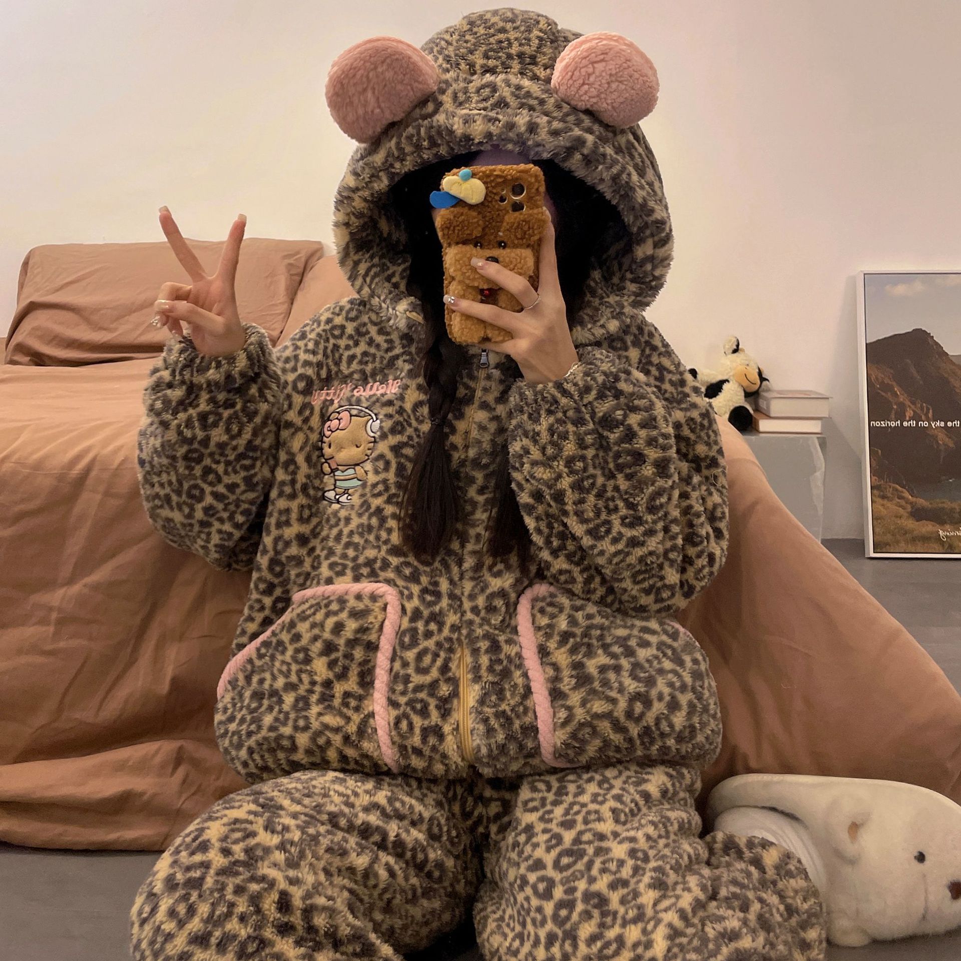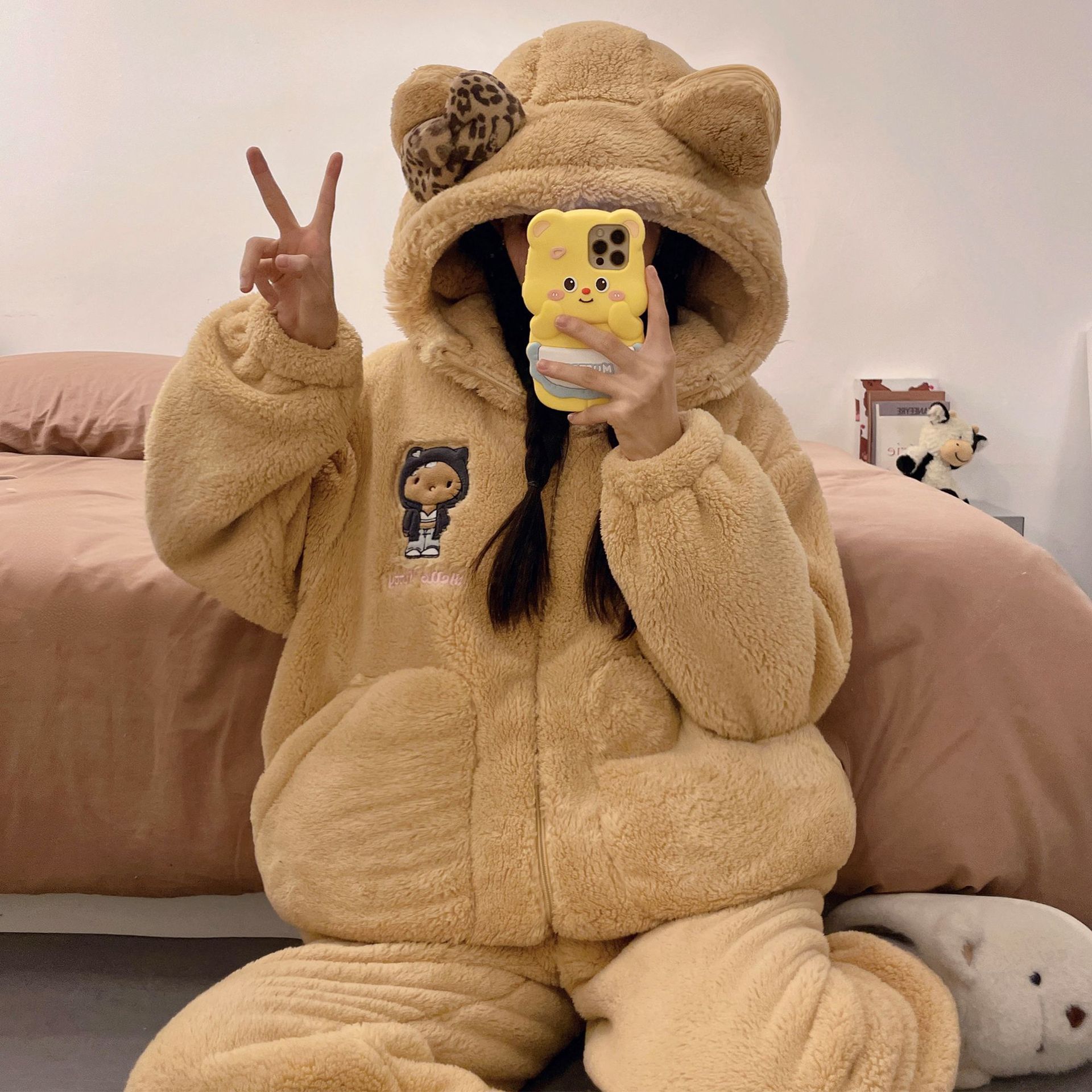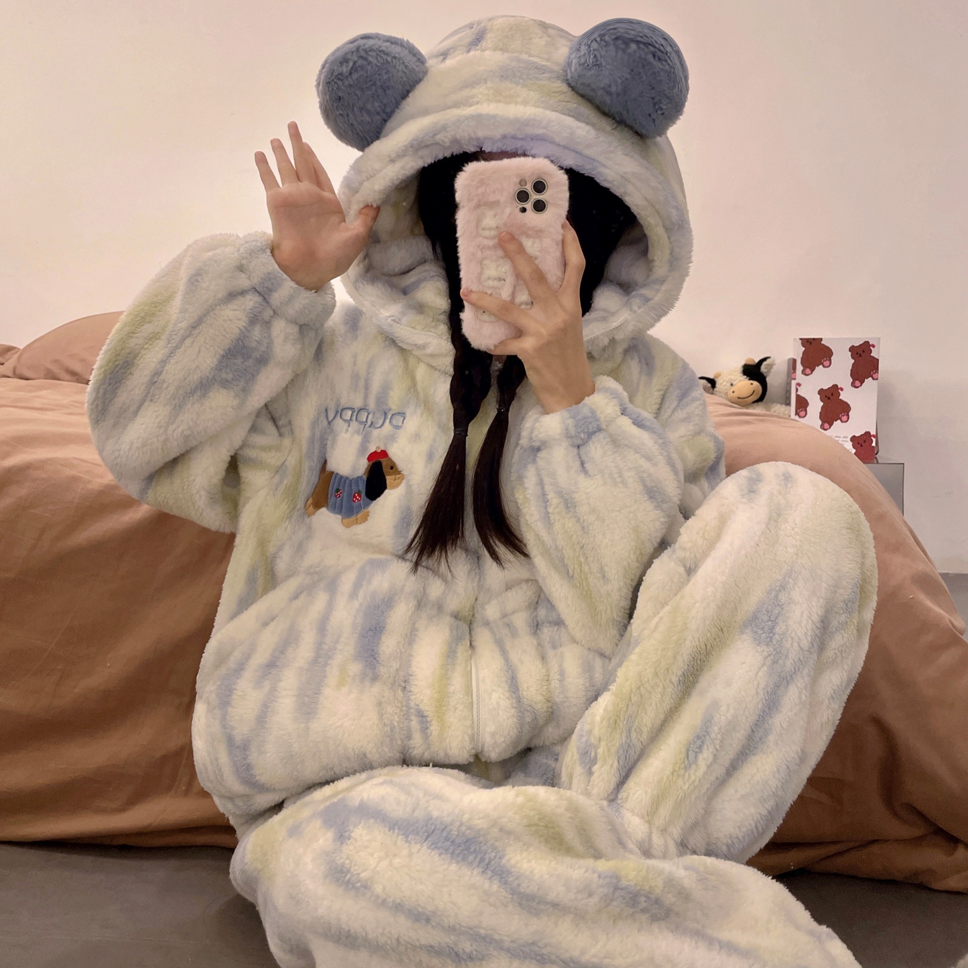 かわいいキティのパジャマ女の新コーラルダウン厚手保温フランネルの部屋着セット